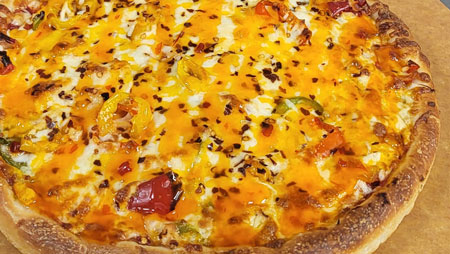 Pepperoni, Banana Peppers, Roasted Garlic, Spicy Sausage, Cheddar & Mozzarella on a bed of our Sweet Tomato Sauce
